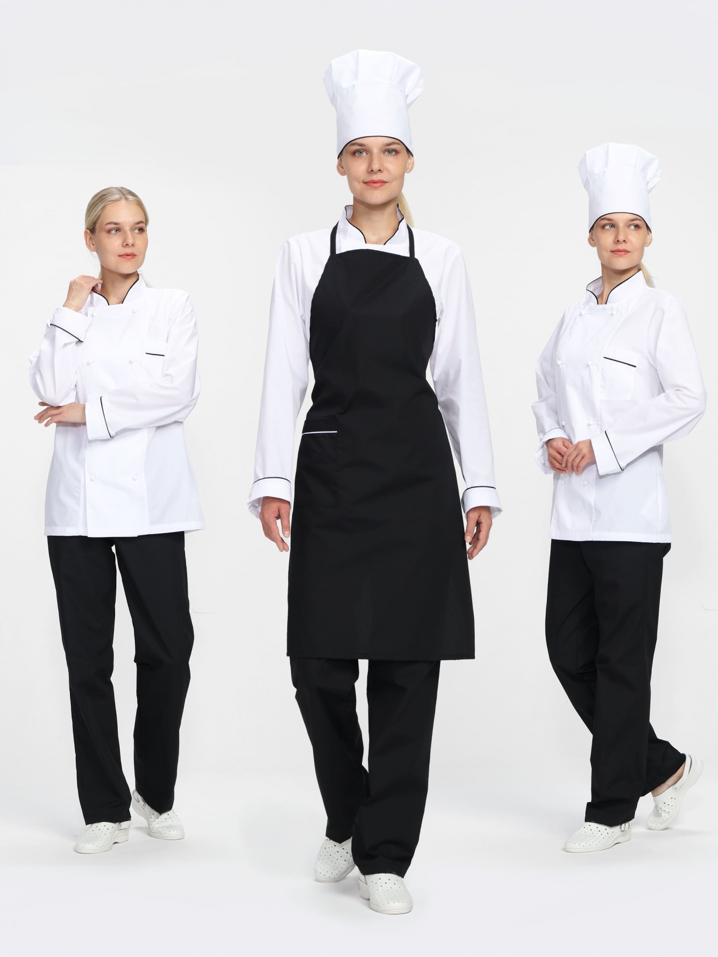 Костюм женский повара Гурман состоит из кителя, брюк, фартука и колпака