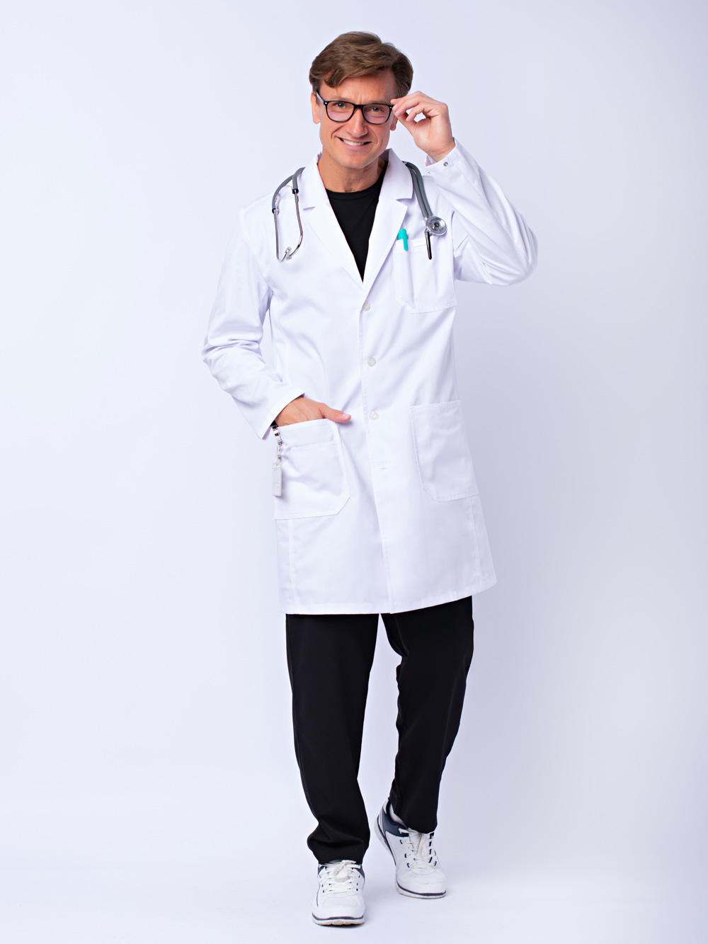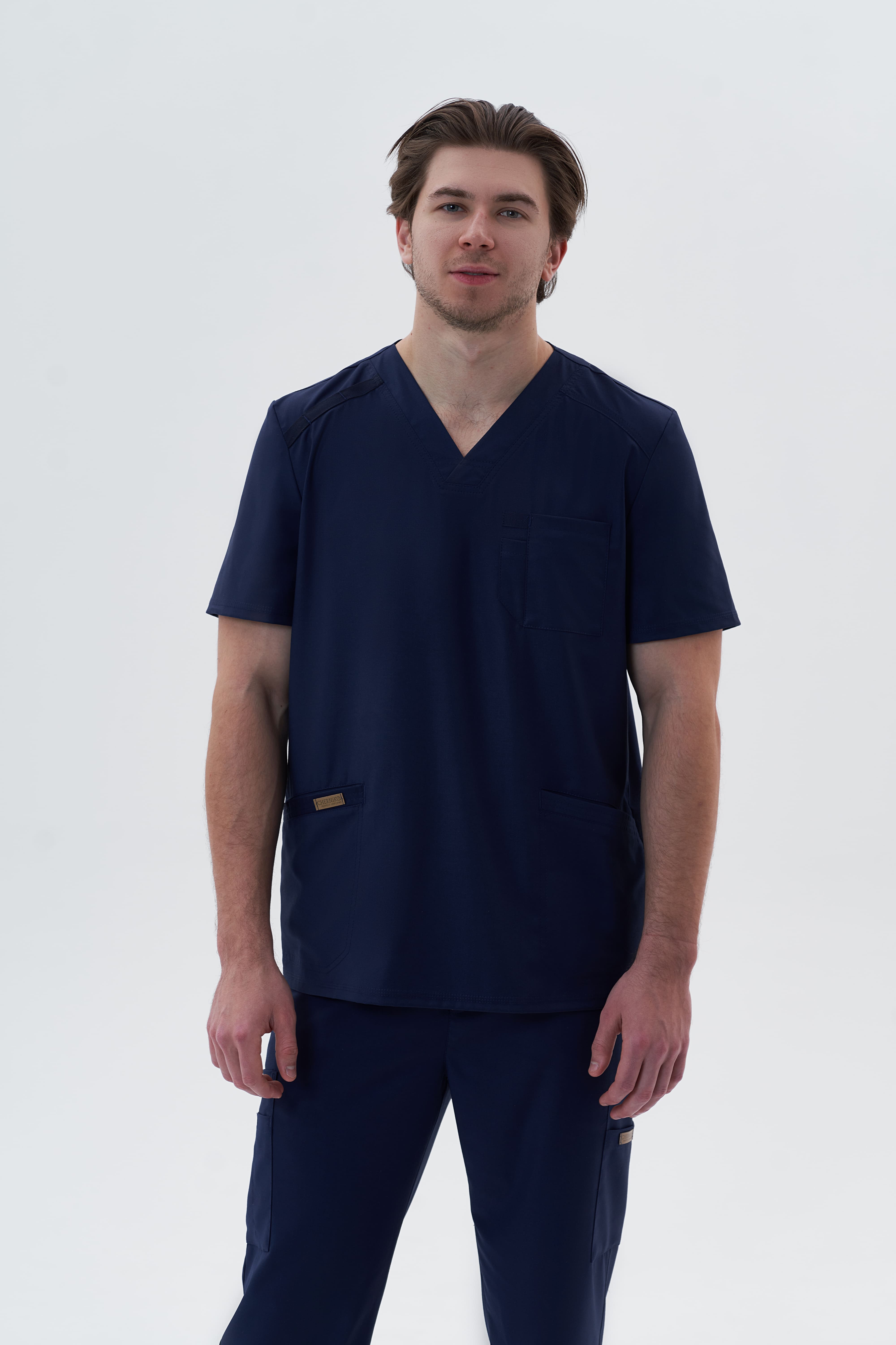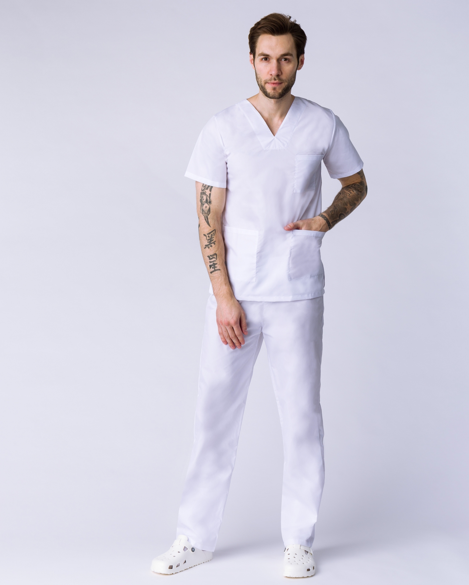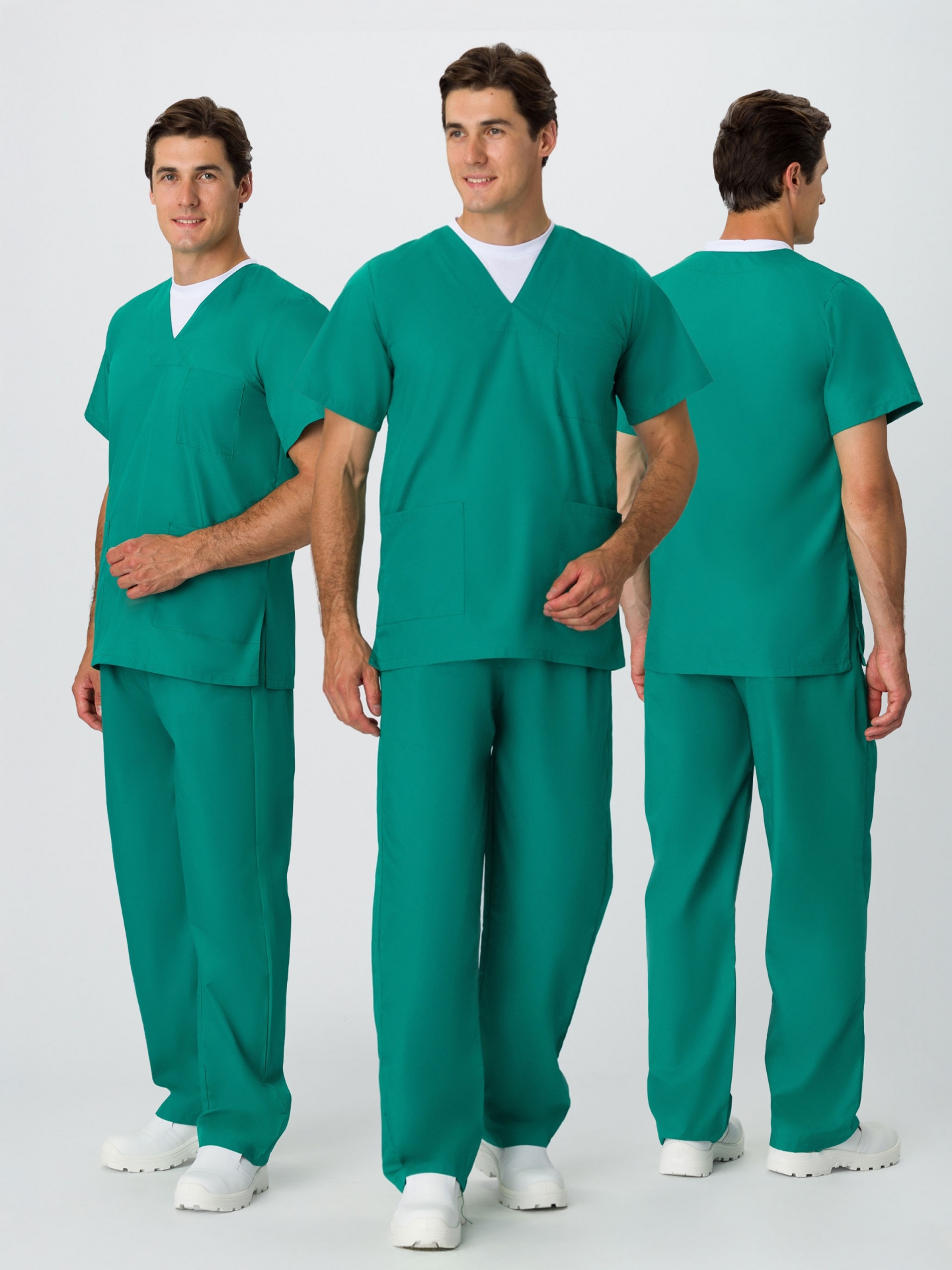 Мужская медицинская одежда, имеет более простой дизайн и практический фасон, допускающий свободу движений. Он часто имеет более нейтральные цвета и прямые линии, а верхняя часть может быть снабжена карманами для хранения медицинских инструментов.
