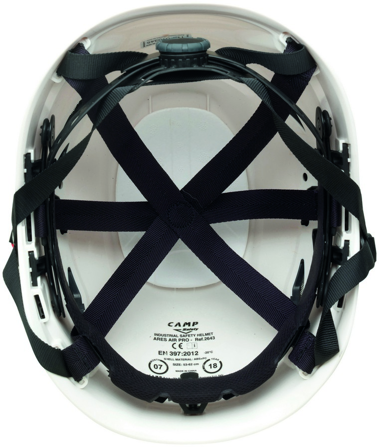 Положение оголовья из полиамидной подкладки регулируется по вертикали. Система регулировки при помощи вращающегося колесика позволяет устанавливать нужный размер одной рукой. На каске установлен комплект мягких подкладок для впитывания пота.