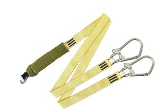Строп имеет две ветви (двойной, двуплечий строп из арамидной ленты с амортизатором рывка в огнестойком чехле), благодаря чему он позволяет работать в режиме само страховки, это когда строп поочередно подсоединяют и отсоединяют к строительным лесам.