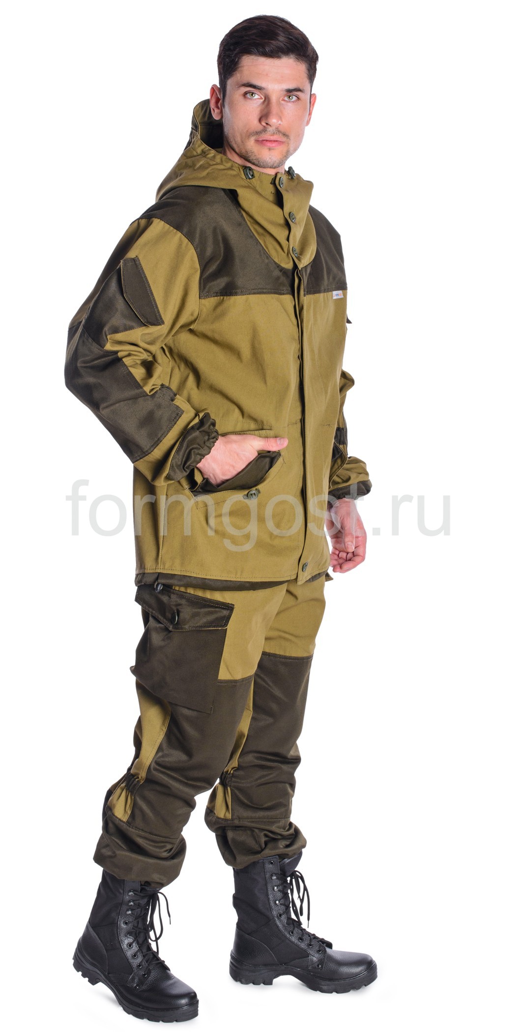 "Горка" прекрасно подходит для защиты от ветра, небольшого дождя и хлестких веток. Костюмы не стесняют движения, позволяя двигаться в любом темпе и штурмовать препятствия. Задние половники брюк под коленом собраны резинкой. Низ брюк на резинке. По низу брюк пришита пылезащитная юбка из бязи.