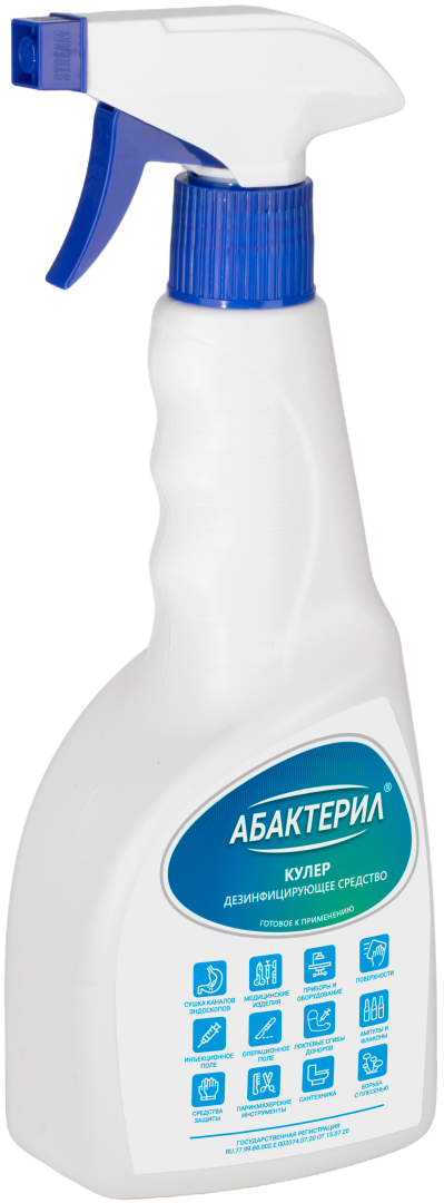 Средство АБАКТЕРИЛ-кулер эффективно против всех видов бактерий (вкл. микобактерии туберкулеза), возбудителей внутрибольничных, особо опасных и зоонозных инфекций, эшерихиоза, легионеллеза, всех известных вирусов-патогенов человека, дрожжеподобных грибов, дерматофитов, плесневых грибов.