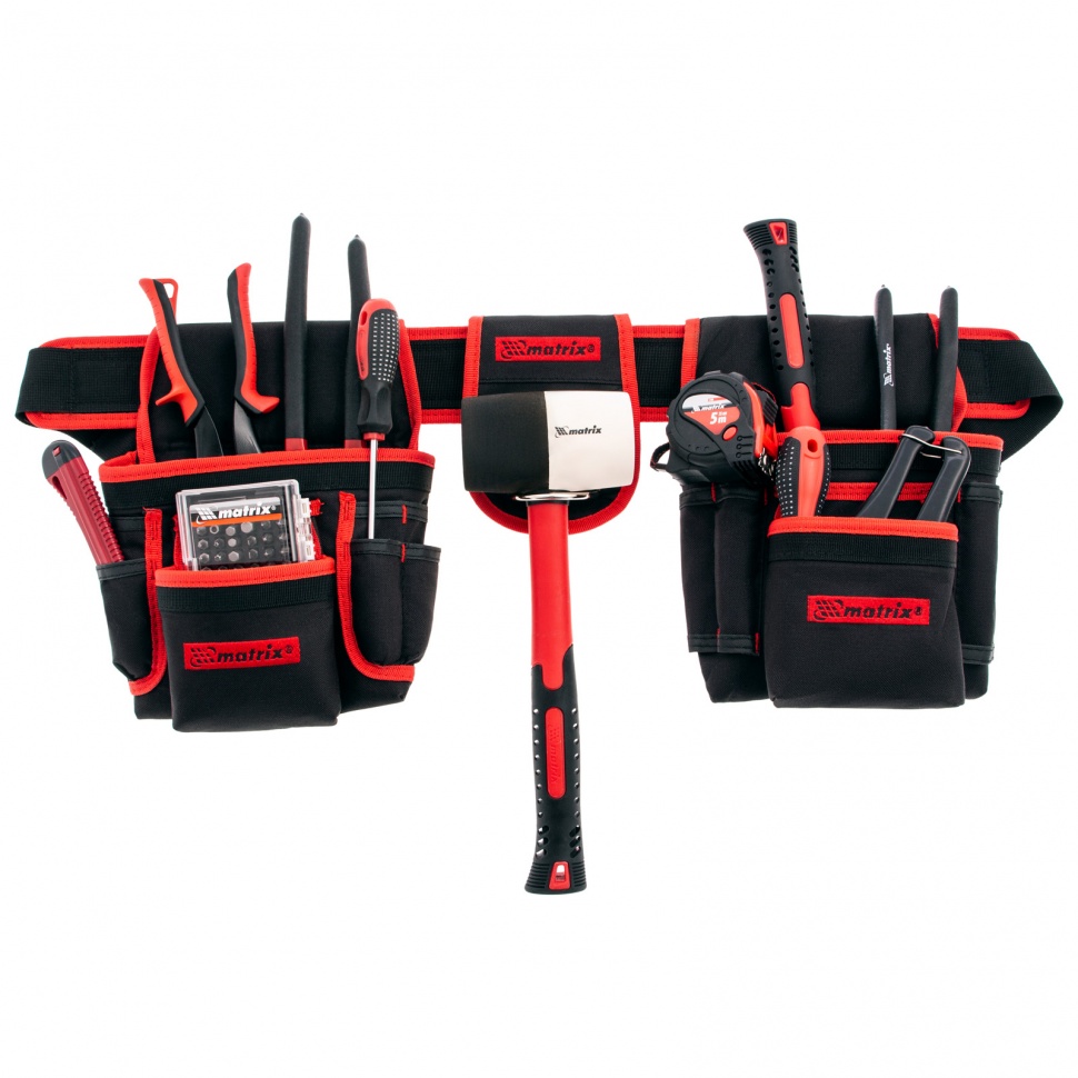 Двойная сумка-пояс Matrix 90240 с 20 карманами и держателем для молотка позволяет всегда иметь при себе необходимые инструменты, при этом оставляя руки свободными.